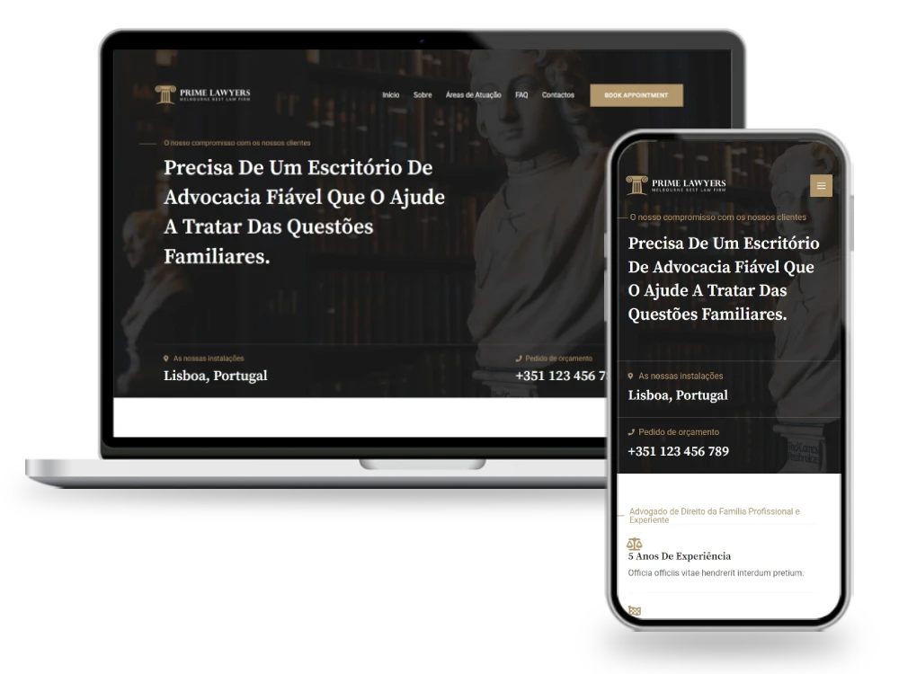 Um template sóbrio, profissional e focado em autoridade. Permite apresentar áreas de atuação, experiência e contactos de forma clara, transmitindo segurança e confiança. Ideal para escritórios que querem reforçar a sua imagem e captar novos clientes sem recorrer a publicidade agressiva.